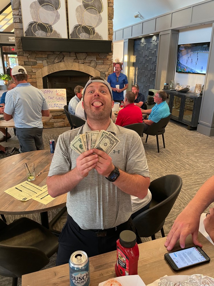 Honorable mentions for the low net score go to GREG GILLICK (38/28) and JIM PLEIMANN (46/28). TONY JOST and JOHN GREFFET grabbed the closest-to-the-pin honors of the night. Meanwhile, KYLE RICKERMANN recovered from his cooter-filled night on Week 7 to bring home one of the skins on the evening (don’t worry though…he still earned a cooter on Week 9).